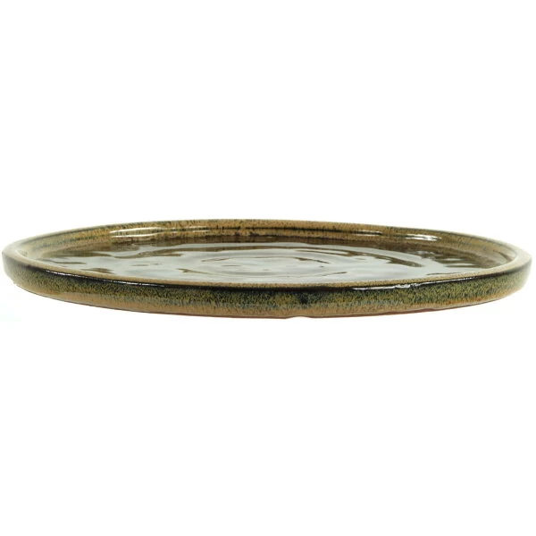 Bonsaischalen Untersetzer (glasiert, beige-braun, rund) in den Abmessungen: 28cm Länge, 28cm Breite, 1.5cm Höhe. Gute Standardqualität aus der Töpferstadt Yixing.