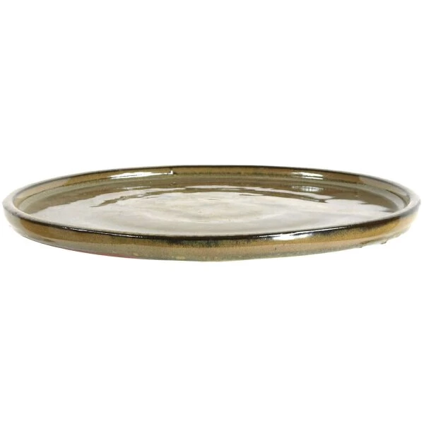 Bonsai Untersetzer (glasiert, oliv, rund) in den Abmessungen: 28cm Länge, 28cm Breite, 2cm Höhe. Im Giessverfahren hergestellt. Gute Standardqualität aus der Töpferstadt Yixing.