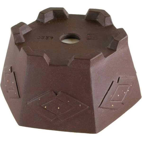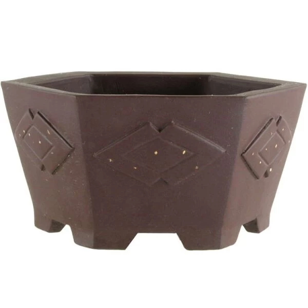 Bonsaischale (Unglasiert, Dunkelbraun, Sechseckig) in den Abmessungen: 10cm Länge, 10cm Breite, 5.5cm Höhe.