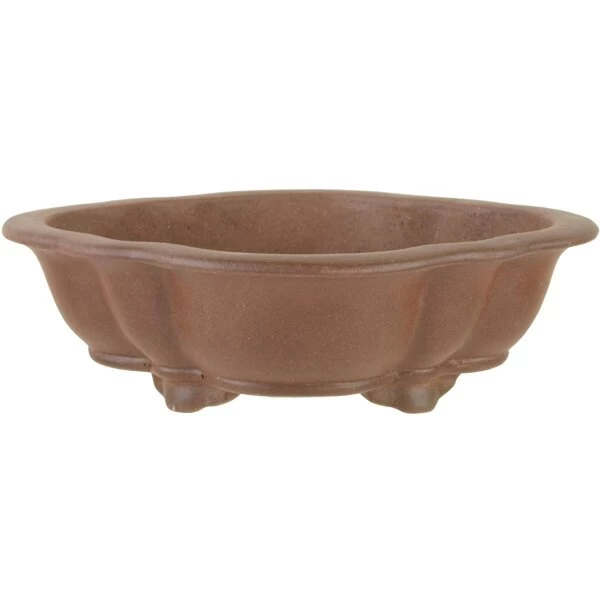 Bonsaischale (unglasiert, antik-braun, lotusförmig), handgemacht, in den Abmessungen: 26cm Länge, 23.5cm Breite, 8cm Höhe.
