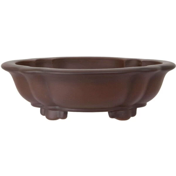 Bonsaischale (unglasiert, antik-braun, lotusförmig), handgemacht, in den Abmessungen: 26cm Länge, 23cm Breite, 8cm Höhe.
