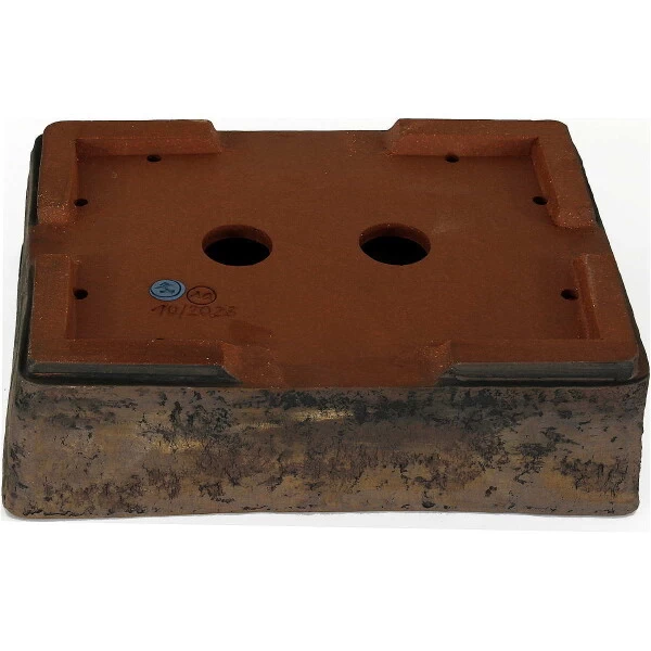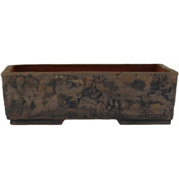 Bonsaischale (Unglasiert, Braun-Dunkelbraun, Rechteckig), handgemacht, in den Abmessungen: 28cm Länge, 20.5cm Breite, 8cm Höhe.