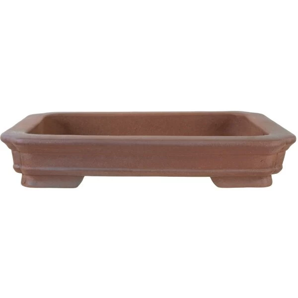 Bonsaischale (unglasiert, antik-braun, rechteckig), handgemacht, in den Abmessungen: 30cm Länge, 25.5cm Breite, 5.5cm Höhe.