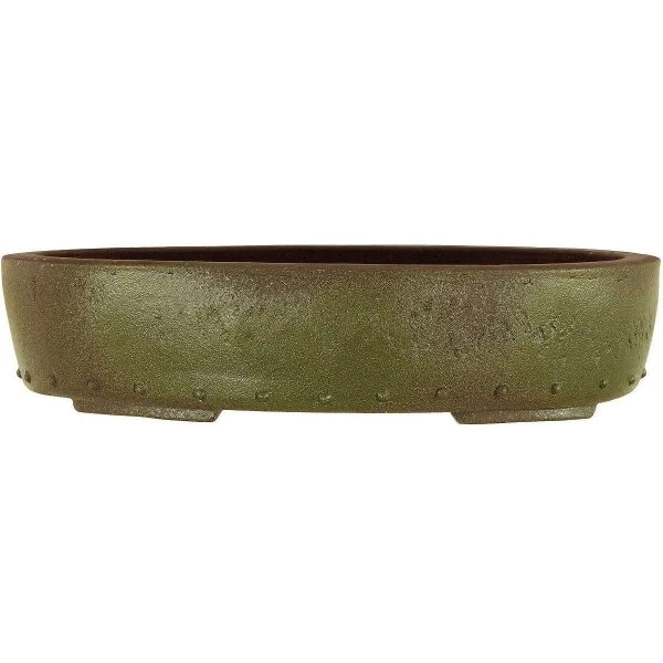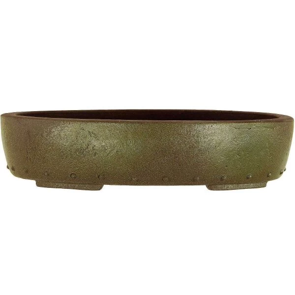 Bonsaischale (Unglasiert, Oliv-Braun, Oval), handgemacht, in den Abmessungen: 33cm Länge, 26.5cm Breite, 7.5cm Höhe.