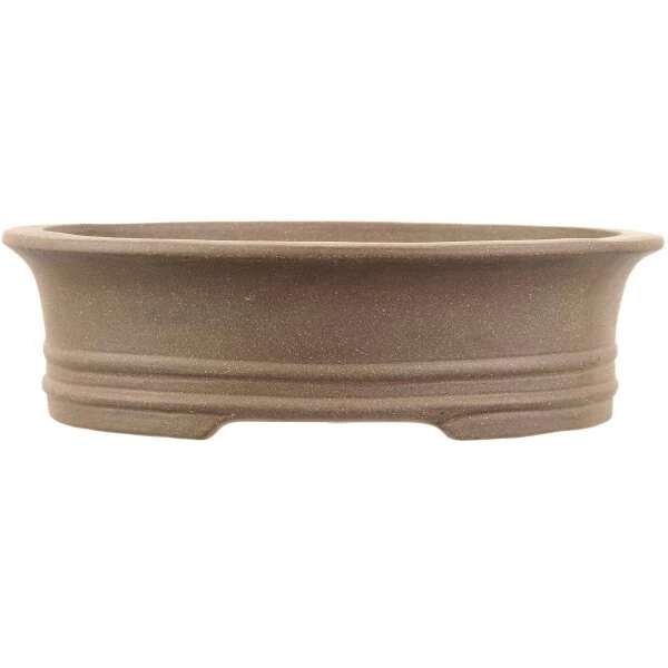 Bonsaischale (unglasiert, grau, oval), handgemacht, in den Abmessungen: 36cm Länge, 29cm Breite, 10cm Höhe.