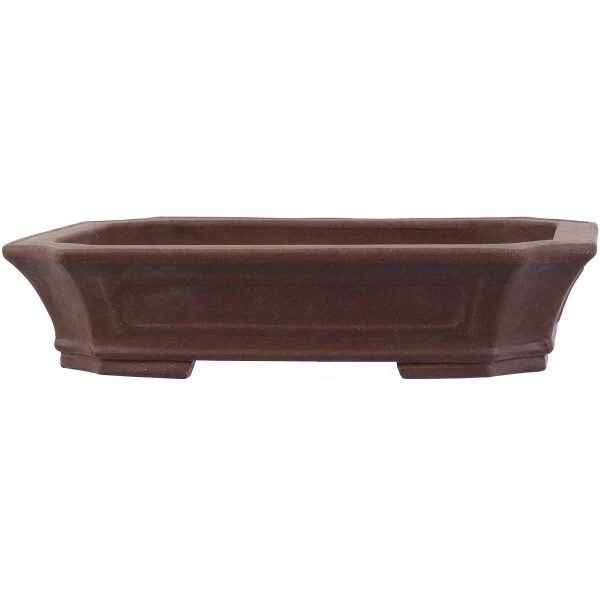 Bonsaischale (unglasiert, braun, rechteckig), handgemacht, in den Abmessungen: 38.5cm Länge, 31cm Breite, 8.5cm Höhe.