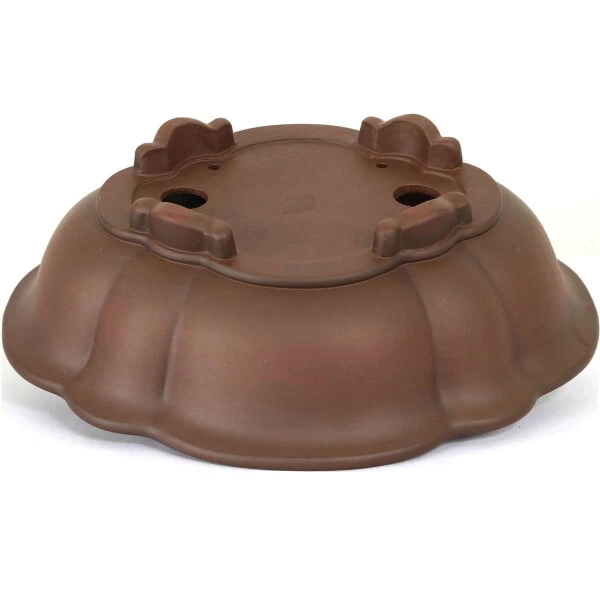 Bonsaischale (unglasiert, antik-braun, lotusförmig), handgemacht, in den Abmessungen: 38cm Länge, 33cm Breite, 11cm Höhe.