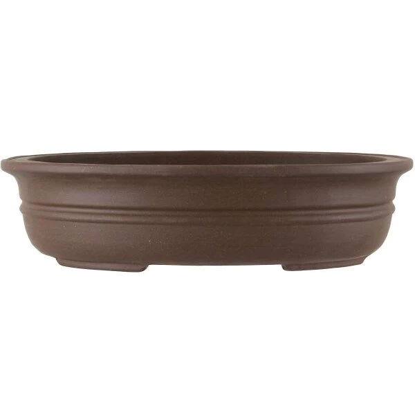 Bonsaischale (Unglasiert, Dunkelbraun, Oval), handgemacht, in den Abmessungen: 49cm Länge, 40cm Breite, 12.5cm Höhe.