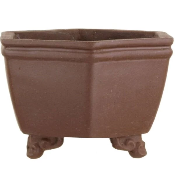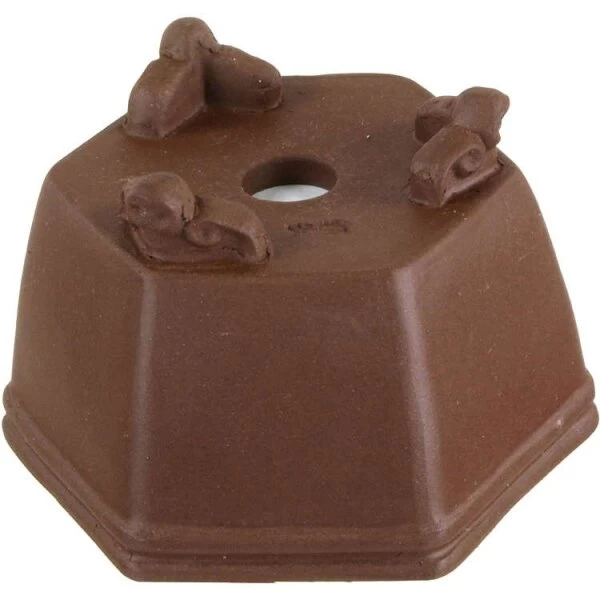 Bonsaischale (Unglasiert, Dunkelbraun, Sechseckig) in den Abmessungen: 7.7cm Länge, 7.7cm Breite, 4.8cm Höhe.