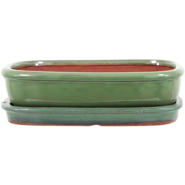 Bonsaischale mit Untersetzer (glasiert, grün, rechteckig) in den Abmessungen: 25.5cm Länge, 19.5cm Breite, 6.5cm Höhe. Gute Standardqualität aus der Töpferstadt Yixing.