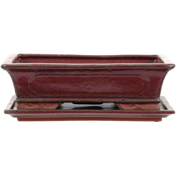 Bonsaischale mit Untersetzer (glasiert, rot, rechteckig) in den Abmessungen: 28cm Länge, 18cm Breite, 8cm Höhe. Gute Standardqualität aus der Töpferstadt Yixing.